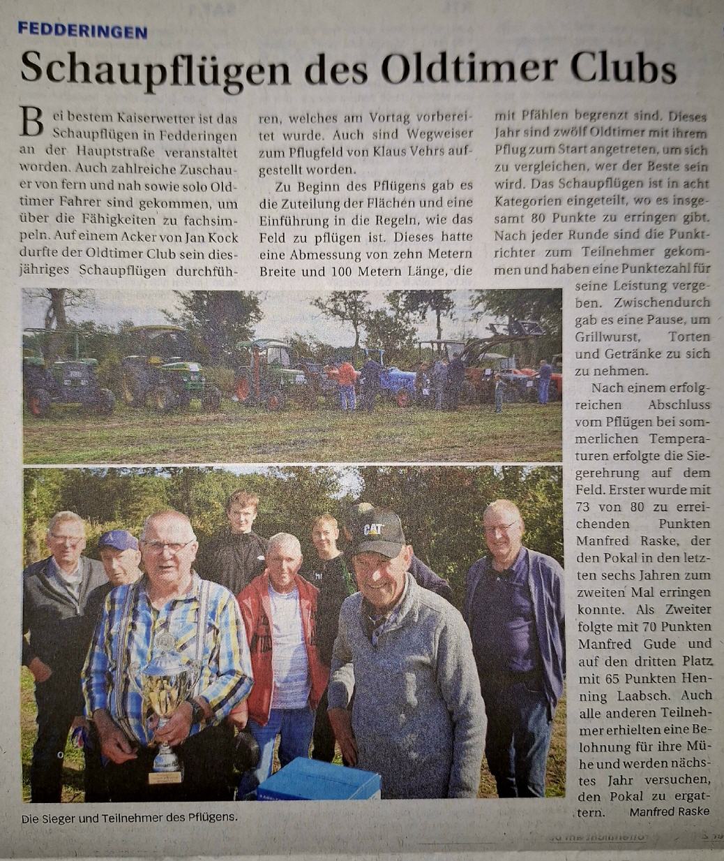 - Sa., 20.09.2025, 9:30 Uhr Eintreffen, 10.00 Uhr Beginn – Pflügen – Fedderingen, Richtung Wiemerstedt, rechte Seite - Bei Regen verschieben wir die Veranstaltung auf Sonntag, 21.09.2025 - Aufbau 19.09.2025 ab 18:00 Uhr - Anmeldungen bis zu 18.09.2025 bei L. Clausen oder G. Offermann.