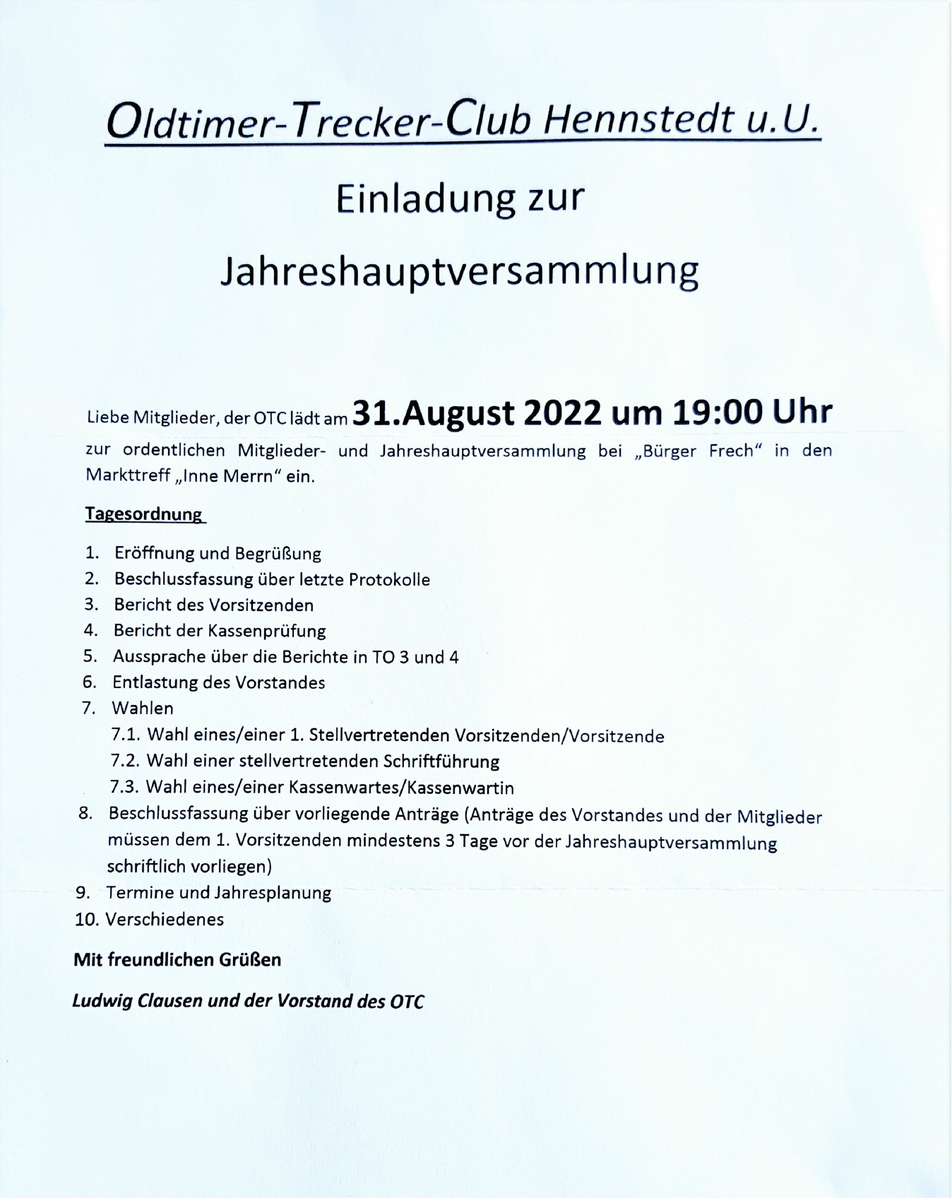 Die Freunde und Vereinsmitglieder des Oldtimer-Trecker-Clubs (OTC) Hennstedt & Umgebung treffen sich jeden letzten Mittwoch im Monat ab 19:00 Uhr in ihrem Vereinslokal "Bürger Frech" im Marktreff in Hennstedt.
